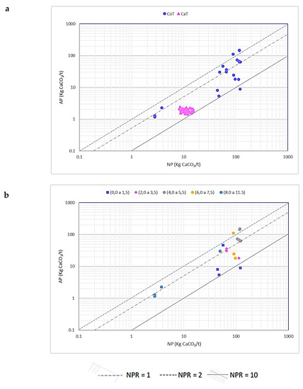 The evaluation of acid mine drainage potential consisted of the comparison of the Modified Acid-Base Accounting (MABA) and Net Acid Generation Test (NAG-test) [50,51]. The acid base accounting (ABA) test is conducted to assess the static potential of generating acidic drainage from a material. It was conducted in accordance with the MEND guide [50] and aims to determine the balance between acid production and consumption from the mineral components of a given sample. Acid production and consumption were measured, respectively, using the parameters acidity potential (AP) and neutralization potential (NP). The NAG-test was carried out in accordance with the MEND guide [51], in which hydrogen peroxide was used to oxidize an aliquot (2.5 g) of comminuted sample (<75 mm). Final pH values (NAG-pH), and electrical conductivity were noted, and the liquor, filtered, was titrated with NaOH solution to defined pH values (4.5 and 7.0) in order to obtain indications on the global amount of non-neutralized acidity, per sample weight. The results of the NAG and MABA tests are compared with each other, allowing a refinement of the interpretation of the latter, and a more improved classification (according to both criteria) regarding the sample’s AMD potential [50,51]. In addition, leaching test derived (SPLP) was carried out in accordance with the USEPA 1312 method [52].