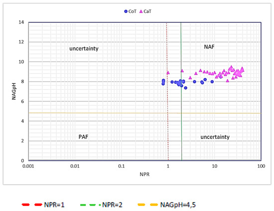 The NAG test (net acid generation) was another method used in order to compare with the results obtained by MABA, mainly because of the S grades. Figure 8 presents the graph NAGpH versus NPR, allowing to correlate the results of the MABA and NAG-tests, and to better refine the classification of acid generation potential of the samples under analysis. The results of the NAG test showed a pH value well above the limit of 4.5, indicating all samples as non-acid-forming, regardless of the result of the NPR. The pH fluctuated from 7.4 to 8.5 for samples from the Cocoruto Dam, and from 8.1 to 9.5 for process samples. These results indicate less potential for liquid acidity than previously indicated, only by the NPR (MABA) criterion. The summary of the assessment of the potential for acidity generation, based on the MABA and NAG, therefore, demonstrates that all process samples resulted in potentially non-acid forming (NAF). Only 45% of the samples collected at the Cocoruto Dam resulted in potentially non-acid forming, using the MABA criterion. However, this number was 100% using the NAG criterion.