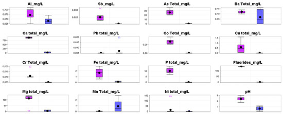 Comparison of the average levels of metals, metalloids, fluorides and pH in SPLP leaching extracts. VMP Al = 0.2 mg/L; VMP Sb = NA; VMP As = 0.05 mg/L; VMP Ba = 1.0 mg/L; VMP Ca = NA; VMP Pb = 0.05 mg/L; VMP Co = NA; VMP Cu = 1.0 mg/L; VMP Cr = 0.05 mg/L; VMP Fe = 0.3 mg/L; VMP P = NA; VMP Fluorides = NA; VMP Mg = NA; VMP Mn = 0.1 mg/L; VMP Ni = 0. 1 mg/L. NA—Not applied for recreation use.