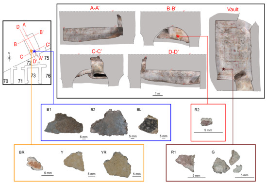 The Sphinx room (room 72/bis) was discovered in 2019 in the Domus Aurea complex while installing scaffoldings in room 72: From a small birch in its northern wall, the polychrome decorations on white background of a barrel-vaulted room were visible. The “fourth style” paintings represent on the North wall (Figure 1B-B’) a small temple and a mythological figure, hence the denomination of the room. On the visible part of the vault terminating in the East (Figure 1A-A’) and West (Figure 1D-D’) walls—the rest being filled with soil—anthropomorphic and zoomorphic figures are surrounded by vegetal motives and enclosed in red frames; on the South wall (Figure 1C-C’), fewer traces of painting are present. Six fragments were collected from the debris in proximity of the South wall, B1 and B2 (blue) and BL (black), and of the corner between the vault, the South and the West wall, BR (brown), Y (yellow) and YR (yellow-red) (Figure 1). Three much smaller fragments were instead sampled from the walls themselves, choosing hidden, already mechanically damaged edges: R1 (red) and G (green) from the vault and R2 (red) from the North wall [10] (Figure 1).