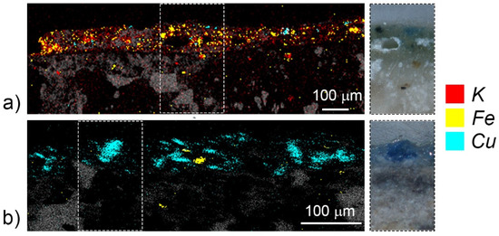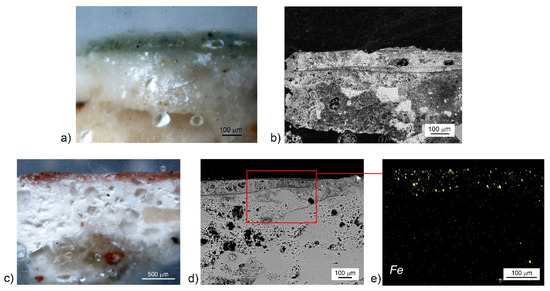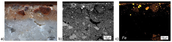 The case of the brown sample BR is somehow analogous, since it exhibits a thick (~350 μm) and coarse light brown undercoat covered by a much thinner (~70 μm) and denser coat (Figure 3a). Once again the fresco technique can be hypothesized: The SEM-BSE observation does not exhibit any carbonation surface between the layers [34] (Figure 3b). Moreover, the chemical map of iron, showing its higher concentration in the most superficial layer, also highlights its dispersion in the plaster (Figure 3c).