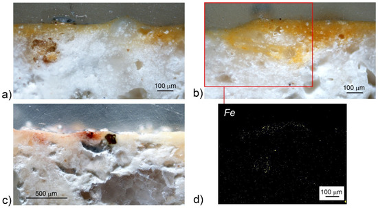 Group II. All the other cross sections show one single pigmented layer. Within this group, clear differences between the samples emerged from the microscopic observations. The yellow (Y) and yellow-red (YR) samples are similar (Figure 1); the latter was cut in correspondence of a tiny red speck of color adjacent to the yellow one (Figure 4c). In both cases, the optical microscopy observation neatly highlighted (1) the variable thickness of the pigmented surface following the shape and unevenness of the base (Figure 4a), (2) the gradual dispersion of color in the plaster, and (3) the total absence of a true pictorial layer with a clear boundary (Figure 4a–c). The penetration of color through a fresh plaster is also evident from the iron distribution map of sample Y (Figure 4d).