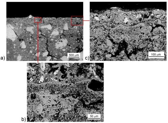 SEM-BSE microphotographs of B2 sample cross section: (a) general view, (b) carbonated intermediate layer, and (c) top carbonation layer and discontinuity.