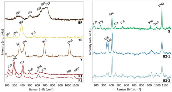 Sample BR shows a brick-red shade both on the surface layer and in some large crystals in the thick light red underlayer. The iron distribution from EDS maps (Figure 3c) clearly shows an iron-based pigment for these similarly colored areas. The Raman spectra acquired on these grains all show similar features: Spectrum BR (Figure 8) is the average of 3 points. The broad bands at 350, 497, and 637–717 cm−1 can support the identification of maghemite γFe2O3 [36,37,38,39]. Maghemite is a yellowish brown compound, which has been reported to form by heating of lepidocrocite γFeO(OH) [37]. As Raman spectra were acquired with 10 mW of a 785 nm laser, this option has to be considered.