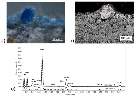Egyptian blue is recognized also on sample B2 (Figure 8 and Figure 10). The simultaneous presence of silicon, calcium and copper in the EDS spectra on the blue areas suggests the presence of cuprorivaite and of other non-stoichiometric compounds associated with the production process of Egyptian blue [46,48,49,50]. The intensity ratios between these elements have been demonstrated to vary, as cuprorivaite and non-stoichiometric compounds are formed according to fabrication processes [50,51]. On the other hand, the darker area indicated as 1 in Figure 10 has a different composition, including also Na, Mg, Cl, K, and Fe. This has been interpreted in literature as a glassy phase of blue color, formed in the production of Egyptian blue, which suggests a specific recipe based on alkali flux, possibly natron (Na2CO3·10H2O), together with costal plant ashes [46,48,49]. The Raman spectra B2–1 and B2–2 in Figure 8 correspond to point 2 analyzed by EDS in Figure 10. The Raman bands of Egyptian blue are clearly visible, and display the doublet at 358–376 cm−1, which is attributed to polarization effects and not to manufacturing processes [46,50].