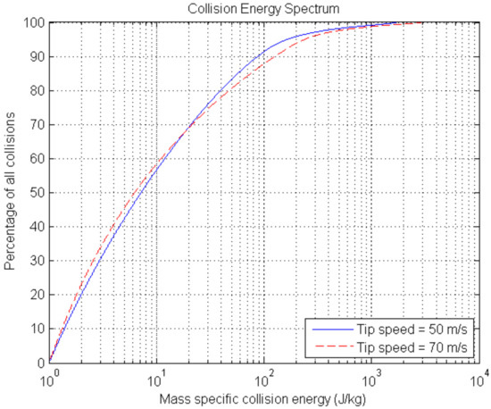The distribution of particle collision energies inside a discrete element method (DEM) simulation of a vertical shaft impact (VSI). Two different rotor tip speeds were simulated.