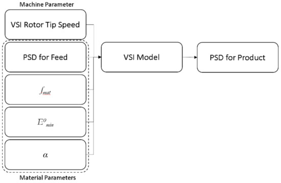 A model overview showing the parameters required to run the VSI crusher model at alternate speeds to predict the product PSD. The model requires a material database with fmat, E0min and α values obtained from previous calibration efforts.