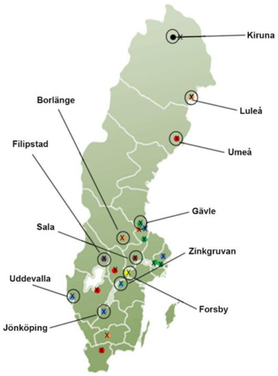 Due to the enclosed design and destructive behavior of comminution machines, it is difficult to directly observe what occurs inside with changes in operational parameters. Experimental data that are measurable for a VSI crusher include the incoming material feed rate and particle size distribution, outgoing mass flow and particle size distribution, rotor tip speed, rotor radius and material properties. These parameters are often quantified on a site-by-site basis to establish the range of products that can be expected with the current setup of machines and the specific ore characteristics. For this model, datasets were collected from different sites throughout Sweden to obtain a comprehensive overview of the performance of the VSI crusher. The material from these sites was crushed with a Metso BARMAC 5100 SE VSI crusher (Metso, Helsinki, Finland), which has a diameter of 510 mm and speeds between 69 and 79 m/s. The conveyer before and after the VSI crusher was stopped to allow material sampling. A conveyor length of 1 m was isolated, and all the material was taken according to the SS-EN 933-1 standard. The intricacies of variation between the sites in terms of materials and machine parameters can create uncertainties in the analysis of its effects. Each source of variation, originating from either equipment, operator, material or site production level, contributes to a potential confounding of the results. The locations of the different sites can be seen in Figure 5 and the overall plant layout used in Figure 6.