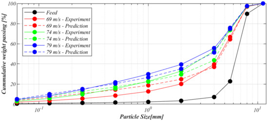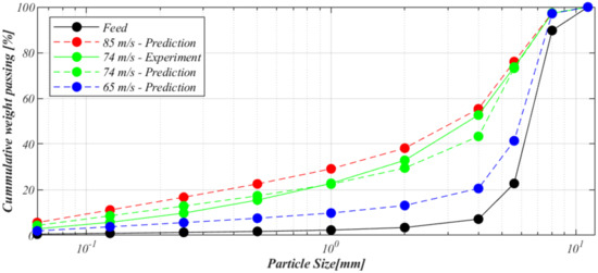 After the model had been calibrated for different sites, an effort to validate it was performed. The feed data and machine parameters for the VSI crushers were then put into the model, and the product was predicted. The speed of the particles at the rotor tip is transformed to kinetic energy, ECS, as seen in Equation (4).