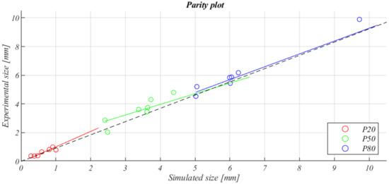 A parity plot of the P20, P50 and P80 values from the experimental data compared to the simulated data using the developed models.