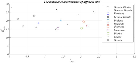 A scatter plot of the fmat and E0min values for different rock types and sites analyzed.
