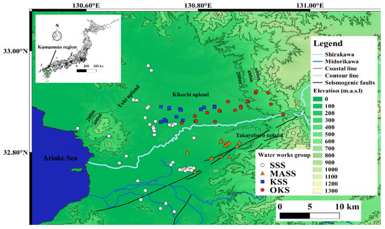 Kumamoto study area with sampling wells. Therein, four water work groups are represented: the Kumamoto City Waterworks and Sewerage Bureau (SSS), Koshi City (KSS), Mashiki Town Waterworks and Sewerage Bureau (MASS), and Water Works Bureau of Ozu Kikuyou (OKS), respectively.