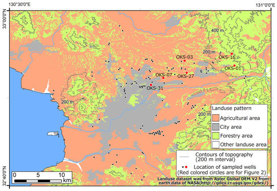 Land-use map with sampling wells in the Kumamoto area.
