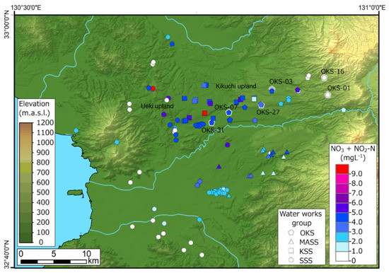 To compare pre- and post-seismic groundwater nitrate change features, pre-seismic groundwater nitrate distribution characteristics for the Kumamoto area are shown in Figure 4. The figure shows that the primary groundwater nitrate contamination area is distributed in the Kikuchi and Ueki upland groundwater recharge area. The land-use of this area is mainly agricultural. However, the groundwater nitrate content is lower in groundwater discharge and stagnant areas due to denitrification processes [29,37]. In general, the spatial distribution of groundwater nitrate content shows large differences within the regional groundwater flow system.