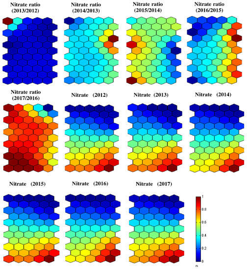 To explore seismic-induced groundwater nitrate changes, average groundwater nitrate contents (2012–2017) from 134 production wells were prepared together with 11 parameters for input to the SOM analysis. Due to the SOM methodology, the number of SOM node reference vectors was 55, with 11 vertical and 5 horizontal columns, respectively. The results of SOM analysis after training are displayed in Figure 5. In the figure, the component values of the 11 parameters are expressed by 55 reference vectors, where vectors were standardized in the range of 0–1. Hence, if a node color is red, it means a comparatively high concentration ratio and high original concentration. If the node color is blue, this means a comparatively low concentration ratio and low original concentration. In general, average nitrate contents for 2012, 2013, 2014, 2015, 2016, and 2017 were similar. This means that the earthquake did not induce a large change in the average nitrate concentration. However, the SOM component maps for nitrate ratios 2016/2015 and 2017/2016 experienced larger changes than the nitrate ratios for 2013/2012, 2014/2013, and 2015/2014. This implies that the 2016 Kumamoto earthquake triggered groundwater nitrate concentration changes in some areas. Besides, the SOM component maps for original nitrate concentrations indicated that some groundwater samples with higher nitrate concentration (4–7 mg/L) were mainly located at the bottom of the SOM maps. On the contrary, some groundwater samples with lower nitrate concentration (<1.6 mg/L) were primarily situated at the top of the SOM maps.