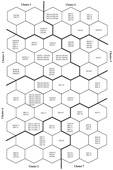 In the SOM analyses, the Davies-Bouldin Index (DBI) was used to determine the optimal cluster number on the basis of k-means algorithms [48]. The value of DBI was calculated from the minimum cluster (2 clusters) to the total number of nodes (55 nodes). Then, the smallest DBI was selected as an optimal number of clusters. After this, a fine-tune cluster analysis was executed using Ward’s method [59]. Based on this methodology, 7 out of the first 10 clusters were selected as optimal cluster number. The pattern classification map for the 7 clusters is shown in Figure 6. Each well number is included in the figure. Combining the pattern classification map and the SOM component maps (Figure 5), it is possible to see that water samples of Cluster 1, 4, and 5 are mainly from low nitrate content areas (<1.6 mg/L). Correspondingly, water samples of Cluster 2 mainly come from high nitrate areas (>4 mg/L). In addition, node locations of Cluster 2 and 6 experienced a relatively large change in the nitrate ratio during 2017/2016. A logical cause of these changes is the 2016 earthquake. In the next section, these processes will be further discussed using the original time-series of nitrate contents for each cluster.