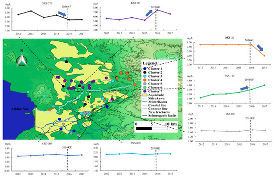 Cluster 2 involves 14 wells. Average groundwater nitrate content is 4.6–5.0 mg/L. These wells are mainly situated in the groundwater recharge area in the Kikuchi upland (Figure 8c). Seismic-induced groundwater nitrate content from 2015 to 2016 decreased slightly according to Figure 9c. A possible reason for this is that original confined groundwater was diluted by fresher water release from the shallow aquifer at the midstream of Shirakawa River and from Kimpo and Aso mountainside areas [18]. Seismic-induced surface ruptures and permeability enhancement give rise to fresh unconfined water rapidly leaching into the original confined aquifer. This process is causing dilution phenomena. It is worth noting that Cluster 6 and 2 are located in the same area. However, nitrate concentration of Cluster 6 shows a small increasing trend. The different trends of Cluster 6 and 2 may be due to the different land-use type as well as heterogeneity of hydrogeological properties.