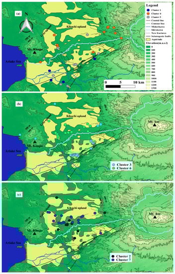 In total, 134 water sample locations were classified into 7 clusters. Based on the spatial distribution of groundwater sampling locations in Figure 7 and Figure 8, the 7 clusters were further divided into three groups depending on nitrate level (Figure 9). Cluster 1, 4, and 5 represent a lower nitrate content region (<1.6 mg/L). This region has less anthropogenic influence and groundwater reduction reaction area (Cluster 1; [29,33,37]). Nitrate content for Cluster 3 and 6 represent intermediate nitrate content (2–4 mg/L). Finally, Cluster 2 and 7 represent a high nitrate region (>4 mg/L). Cluster 2, 3, 6, and 7 are high-productive agricultural and urbanized areas. The nitrate changes for representative wells in each cluster are displayed in Figure 7. As seen from the figure, the well KSS-06 has an obvious increase in nitrate concentration in connection to the earthquake. Another well, SSS-112, shows slightly increasing nitrate concentration. These two wells are located in the Kikuchi groundwater recharge area. Possible causes for the groundwater nitrate increase here are effects of the earthquake by ground shaking and new rupture formation. These processes appear to have triggered high nitrate concentration of soil water and shallow groundwater that penetrated the aquiclude and rapidly released into the confined aquifer. The results were increased groundwater nitrate content. However, two wells displayed a decrease of groundwater nitrate content. One of these, well OKS-26, showed a clear decease of nitrate concentration. It is located in a mountainside area. The other, SSS-076, displayed a small decrease in nitrate content. A possible mechanism for these wells is that seismic-induced originally clean mountain water (OKS-26) and shallow groundwater flowed into the original confined aquifer at the hillside area (SSS-076). This process diluted the original groundwater in the two wells. The three other wells, SSS-023, SSS-069, and SSS-080, had no significant nitrate content change.