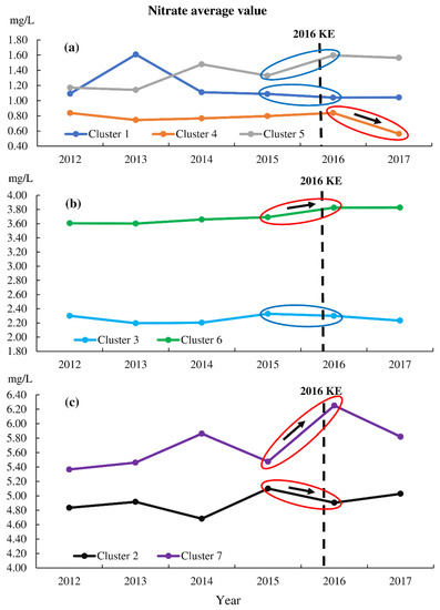 Cluster 5 includes 9 wells. Mean groundwater nitrate content fluctuated in the range of 1.2–1.6 mg/L. These samples are sparsely distributed over a quite large area (Figure 8a). By comparing pre- and post-seismic nitrate content from 2015 to 2016, it is seen that nitrate concentration increased by 0.2–0.3 mg/L from mean concentration at shown in Figure 9a. However, a similar increasing trend was also observed between 2013 and 2014. This means that the increasing trend for nitrate content may be mainly from increasing groundwater pollution, not as a result of seismic effects.