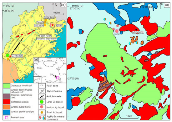 The volcanic fault-depression belt in Eastern Fujian Province is one of the most important prospective areas for silver polymetallic mineralization [1]. The main types of silver–polymetallic deposits in the belt are the hydrothermal vein type, the volcanic-subvolcanic hydrothermal type, the magmatic hydrothermal type, and the contact metasomatic type [2,3,4]. Since the 1980s, more than ten deposits have been discovered in this area, including the Zherong Yingshan large-size silver deposit, the Zhouning Tongcha silver deposit, the Zherong Makeng silver–polymetallic deposit, and the Pingnan Luocuo silver–lead–zinc deposit [5,6]. Previous studies focused mainly on the Zijinshan porphyry–epithermal Cu–Au metallogenic system and some large epithermal and porphyry deposits [7,8,9]. However, the origins of the silver–polymetallic deposits in the belt are poorly understood.