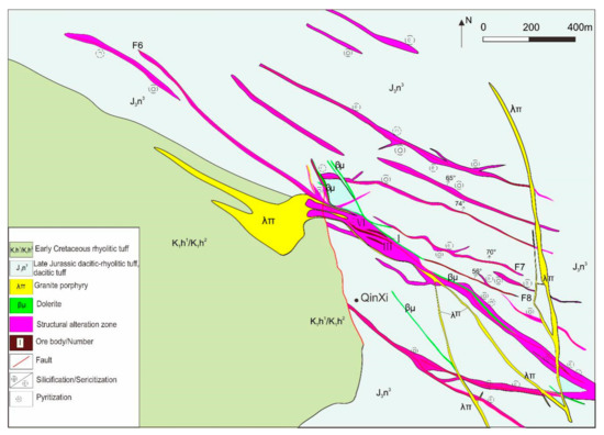 The Qinxi mining area is located along the boundary between the early Cretaceous volcanic belt northwest of Pucheng–Ningde city and the late Jurassic volcanic belt northeast of Shouning–Meilin city (Figure 1). Outcrops in the mining area are mainly volcanic rocks from the Nanyuan Formation and Shimoshan Group. Qinxi silver ores occur in the rhyolitic ignimbrite of the Nanyuan Formation. In total, 400 tons of silver have been identified. The silver ore-bearing alteration veins are controlled by WNW–NW trending faults. For example, nine structural alteration zones with WNW–NW orientations were found at the edge of the Shimoshan basin (Figure 2).