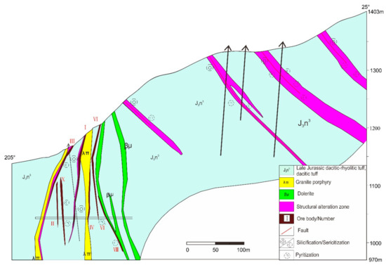 About 35 silver polymetallic ore bodies have been identified in the north–west trending mineralized belt. The gold and silver mineralization occurs over an outcrop area of about 1.6 km2. Ore bodies are mainly distributed in the F6, F7, and F8 belts (Figure 2) and are generally uplifted to the northeast with representations of large and small ore veins. The morphology of the ore body is controlled mainly by the two northwesterly trending rhyolitic porphyry veins. The dip angles of the ore body vary from 45° to 80° and are concentrated at 60°~70°. The total size of the ore body is 400 m long and 100~150 m wide, with a controlled elevation from around 850 to 1130 m. Most of the ore bodies are concealed (Figure 3). Ores in Qinxi have typically crystallographic, metasomatic, and metamorphic textures and cataclastic, vein-like, reticular, massive, and brecciform structures (Figure 4). The ore minerals are mainly sphalerite, galena, and pyrite, followed by chalcopyrite, argentite, silver-bearing chalcocite, bornite. Gangue minerals include quartz, sericite, kaolin, chlorite, pyrophyllite, and other medium to low temperature hydrothermal minerals.