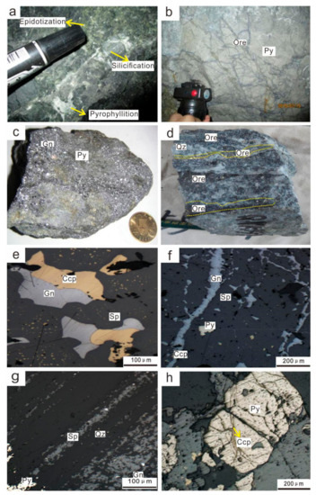Typical structures of the ores. (a) Reticular vein-like ore and crystal caves; (b) breccia structure and lead–zinc veins; (c) massive lead, zinc, and silver ores; (d) vein-like lead, zinc, and silver ores; (e) crystal structure between sphalerite, galena, and chalcopyrite; (f) metasomatism structure (galena interspersed sphalerite in the form of veins and dykes; (g) metamorphic structure (directional deformation of pyrite and sphalerite due to a dynamic effect; and (h) mesh-vein structure. Sp—sphalerite, Gn—galena, Py—pyrite, Qz—quartz, Ccp—chalcopyrite.