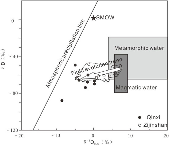 H and O isotopes are effective tracers for ore-forming fluid sources [45,46]. Our results are relatively concentrated between the magma water and meteoric precipitation in the δD-δ18OH2O diagram (Figure 6) (δD = −85‰~−40‰, δ18OH2O = 5‰~9.5‰) [47] and show a trend of deviation from the magmatic water to the direction of meteoric precipitation, indicating that the ore-forming fluid in the study area represents the mixing of magmatic (volcanic) gas–liquid and shallow groundwater. For comparison, the data from adjacent and contemporaneous Zijinshan ore deposits are also plotted in Figure 6. The H and O isotopic compositions of Zijinshan ore have wider ranges and are closer to the magmatic water box, while those of the Qinxi deposit are closer to the atmospheric precipitation area, suggesting different proportions of the two reservoirs. Some samples from Zijinshan ore were plotted away from the magmatic water area, which may have been influenced by the early fluid evolution from magmatic water to atmospheric precipitation in the later stage [46,48]. Recent studies have shown that meteoric water plays an important role in the hydrothermal system [49], and increasingly more evidence suggests that middle and low temperature hydrothermal fluids are mainly the mixed genesis of primary magmatic water and meteoric precipitation. The H and O isotopic compositions of the Qinxi deposit are consistent with the composition of many medium to low temperature hydrothermal deposits with ore-forming fluids mainly from the mixed water of volcanic hydrothermal and meteoric precipitation.