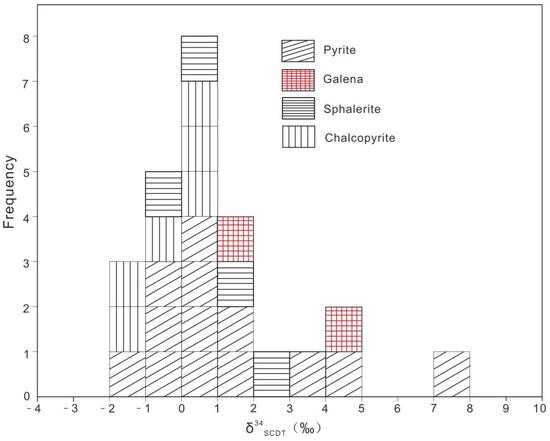 The sulfur isotopic compositions are listed in Table 3. In total, 25 sulfides from the Qinxi ore deposit have a δ34S range from −1.7‰ to 7.1‰, with an average value of 0.92‰ and clustered around −1.7‰~4.1‰. The δ34S values of pyrite range from −1.3‰ to 7.1‰, with an average of 1.30‰; the δ34S values of sphalerite range from −1.7‰ to 0.8‰, with an average of −0.43‰; the δ34S values of galena range from −0.8‰ to 2.1‰, with an average of 0.78‰; and the δ34S values of chalcopyrite range from −1.7‰ to 0.8‰, with an average of −0.43‰. The sulfur isotopes from ore sulfide vary within a narrow range and are concentrated with a peak value of about 0.5‰ (Figure 7).