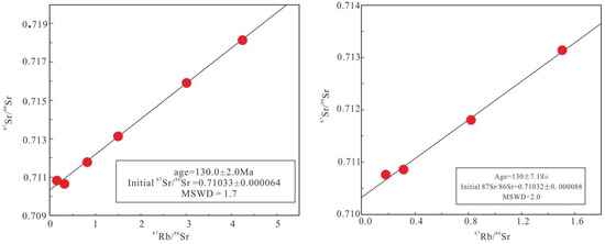 The Rb and Sr concentrations and isotopic compositions of the six samples from Qinxi are shown in Table 5. The isochronous lines were constructed from different mineral combinations between single minerals and paragenetic minerals so that the isochronous ages of single minerals and symbiotic minerals could be constrained to each other, thus improving the accuracy of the isochron lines and obtaining relatively accurate metallogenic ages [39]. The Rb–Sr isochronic line obtained in our study shows a good linear relationship (Figure 8). The ISOPLOT package software was used to calculate the isochron ages. Mineral galena and sphalerite had an Rb–Sr isochron age of 130 ± 2.0 Ma (Figure 8a), with an initial ISr = 0.71033 and MSWD = 1.7. The single mineral galenas had an Rb–Sr isochronal age of 130 ± 7.1 Ma (Figure 8b), with ISr = 0. 71032 and MSWD = 2.0, indicating the same isochron age for both galena and sphalerite within the margin of error.