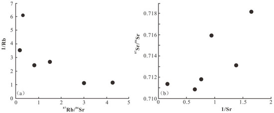 The samples analyzed in this study were all large Pb–Zn samples from the main metallogenic stages at different locations of the Qinxi ores with high purity. No gangue minerals or fractures were observed under the microscope [40]. Our dating results suggest the Qinxi silver ore was formed at 130 ± 2 Ma (MSWD = 1.70) (Figure 8a). The sphalerite and galena with different Rb and Sr concentrations had similar 87Sr/86Sr values (Table 5). No linear correlations were observed in the 1/Rb vs. 87Rb/86Sr and 1/Sr vs. 87Sr/86Sr diagrams (Figure 9). Thus, the initial ratios of 87Sr/86Sr in the sphalerite and galena were well-preserved.
