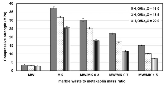As seen in Figure 1, the MW reference specimens exhibited very low compressive strength for all the H2O/Na2O molar ratios used, indicating the poor alkali activation potential of marble waste, due to its extremely low content of silica and alumina, as shown in Table 2. On the other hand, the MK reference specimens exhibited much higher compressive strength, which in all cases exceeded 25 MPa and reached in the optimum synthesis conditions 37.3 MPa. This is the reason why marble waste was mixed with metakaolin which due to its high content of silica and alumina possesses a much higher inherent alkali activation potential; the beneficial behavior of metakaolin during alkali activation has been underlined by many researchers who investigated mixtures of metakaolin and various municipal and industrial wastes for the production of AAMs with good mechanical and physico-chemical properties [28,29,30,31,32,33,34].