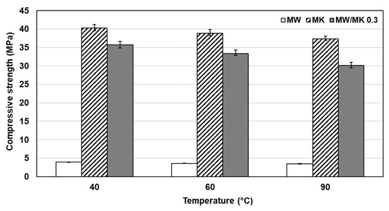 The effect of curing temperature (40, 60 and 90 °C) on the compressive strength of the AAMs produced using marble waste (median particle size 17.9 μm) to metakaolin mass ratio 0.3 and H2O/Na2O molar ratio in the activating solution 16, is illustrated in Figure 2. The compressive strength of MK and MW reference AAMs is given again for comparison.