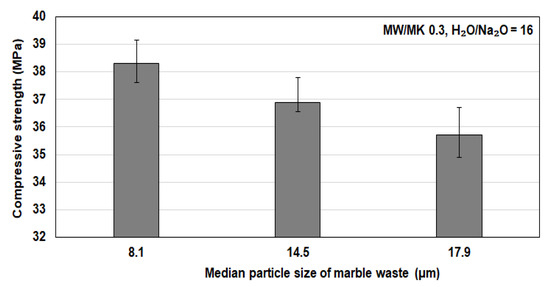 Figure 3 illustrates the effect of median particle size of marble waste (8.1, 14.5 or 17.9 μm) on the compressive strength of AAMs produced using marble waste to metakaolin mass ratio 0.3 (MW/MK 0.3 AAM), H2O/Na2O molar ratio 16, and curing temperature 40 °C.