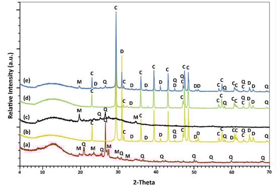 X-ray diffractograms of the raw materials (a) metakaolin, (b) marble waste, and the AAMs (c) MK, (d) MW, and (e) MW/MK 0.3, produced under the optimum conditions (H2O/Na2O molar ratio 16, curing temperature 40 °C). Identification of phases: C: Calcite (CaCO3), D: Dolomite [CaMg(CO3)2], Q: Quartz (SiO2) and M: Muscovite [KAl2(AlSi3O10)(OH)2].
