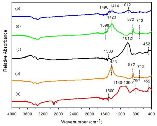 The spectra of raw marble waste (Figure 5b) and MW AAM (Figure 5d) did not show any considerable changes, indicating that marble waste is poorly alkali activated. The bands at 712, 872 and 1423 cm−1, illustrated in both spectra represent CO3 vibrations due to the presence of CaCO3 [45,46]. In the spectrum of the MW/MK 0.3 AAM (Figure 5e) the peaks at 1414 and 1490 cm−1 are due to atmospheric carbonation [47]. The band seen at 1500 cm−1 corresponds to H-O-H vibrations of absorbed water, while the peak at 1598 cm−1 is due to the presence of chemically bonded water [48].