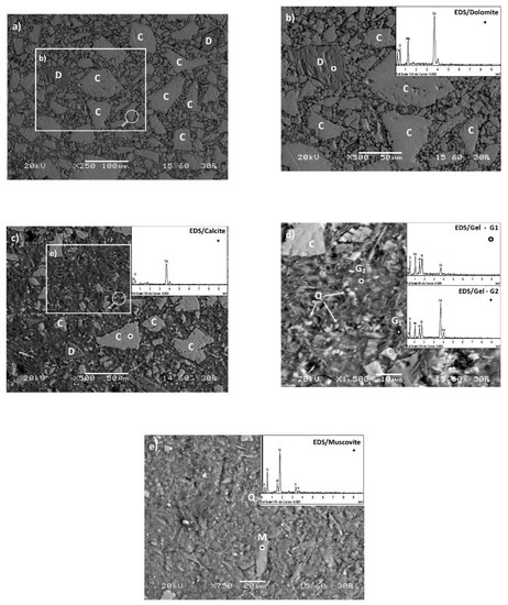 SEM-BSE images of polished cross-sections of selected AAMs produced under the optimum conditions (H2O/Na2O molar ratio 16, curing at 40 °C for 24 h): (a,b) MW, (c,d) MW/MK 0.3 and (e) MK. EDS spectra show in several spot locations the presence of oxide phases, the formation of mixed aggregates and newly formed inorganic gels (C: Calcite, D: Dolomite, M: Muscovite, Q: Quartz, G1:Gel Na-rich, G2: Gel Ca-rich).