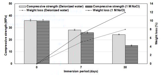 Figure 7 shows the evolution of the compressive strength and weight loss of the MW/MK 0.3 ΑΑΜ after immersion in deionized water and 1 mol/L NaCl solution for 7 and 30 days.