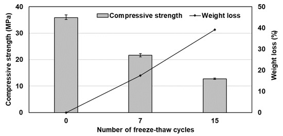 In addition, the structural integrity of the produced AAMs was severely affected after subjection to freeze–thaw tests, and the compressive strength loss after 7 cycles reached almost the value of 40%. This is attributed to the high porosity (25.1%) and water absorption (14.2%) values of the initial specimens.