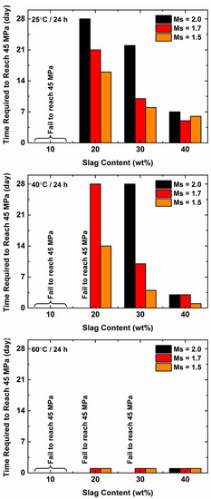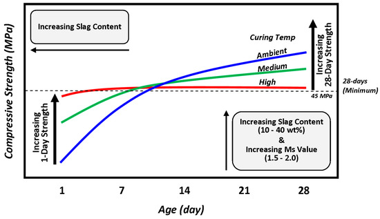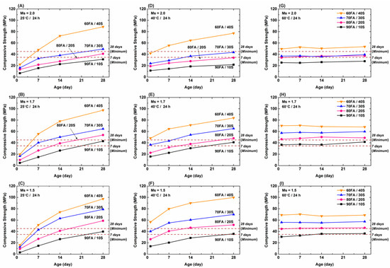 Figure 2A–I show the effects of ageing (in days) on the compressive strength development of geopolymer mortars as a function of curing temperature (for 24 h), Ms value, and slag content while Figure 3 shows the minimal time required for samples to reach the 28-day compressive strength. The key observations are as follows: