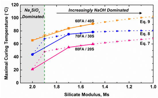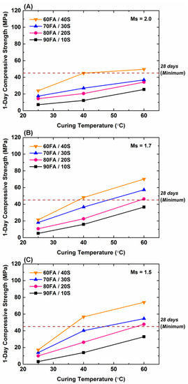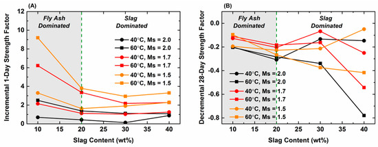 The key differentiating feature between these two empirical studies and the present work is that the former involved Ms values in the range 0.96–1.4 while the latter involved Ms values in the range 1.5–2.0. Examination of Figure 2A demonstrates that a combination of high curing temperature and low Ms value results in significant strength increase whereas Figure 6 shows a slight strength decrease. Consequently, these converse results are largely a result of the differences in Ms values at temperatures of ambient and above.