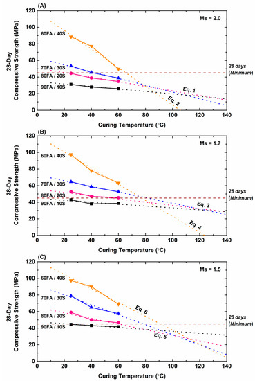 In the other direction, the data in Figure 8A–C for lower temperatures show that, at 10°C, the extrapolation in σ128 essentially trends to negative values for the geopolymer mortars. This suggests that geopolymer mortars with the corresponding compositions will not set within 24 h of curing under such cooling conditions.