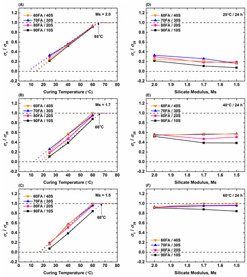 Figure 8A–F shows the correlation between the ratio of the 1-day and 28-day compressive strengths (σ128) as a function of curing temperature, Ms value, and slag content. The temperature at which the two strengths equalise at high temperatures is shown by the horizontal dashed lines, which are approached by the extrapolations of the experimental data. It can be seen that σ128 increases linearly with curing temperature and that the rates (slopes) are nearly identical. It is clear that the geopolymer mortars cured at 60 °C achieved nearly maximal compressive strengths within 24 h of curing, so there is only a modest advantage to be gained from heat curing at temperatures >60 °C for the lower slag contents. It also can be seen that this compositional effect decreases with increasing Ms value. Finally, all of the extrapolations converge at a curing temperature of ~65 °C, which suggests that heat curing for the purpose of rapid strength development in 24 h, regardless of Ms value and slag content, would be optimised at this curing temperature. Since the maximal curing temperature in these data is dictated by the slag content of 10 wt%, the slight effect of Ms value can be seen through the shift in the intersections of the extrapolations and the σ128 = 1.0 line (TMax):