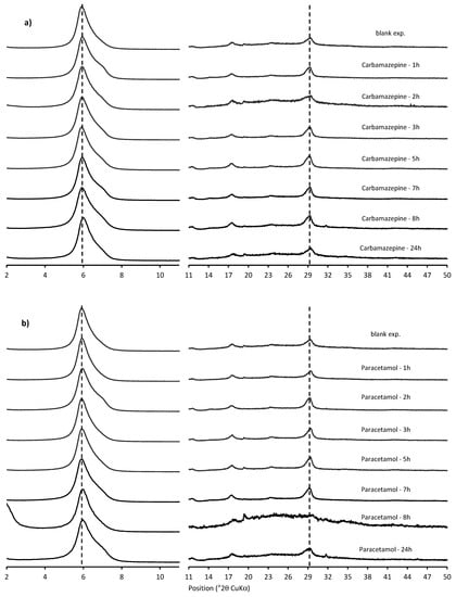 X-ray diffraction patterns of saponite (Sap) contacted with (a) carbamazepine and (b) paracetamol for different times (see text for details). Exposure time to organic contaminants increases from top (blank—no contact) to bottom. Dashed lines indicate the position of diffraction lines typical for bi-hydrated smectites (14.9 and 3.05 Å).