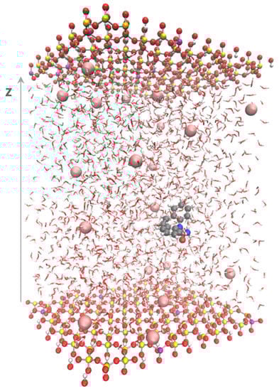 The ClayFF force field was used for the clay model [], whereas water and ions were modeled using the extended simple point charge (SPC/E) and Dang models, respectively [,]. The SPC/E model is known to accurately reproduce water’s structure []. The general Amber force field [] was used to generate the PCs’ molecular parameters and Lorentz–Berthelot rules were applied for inter-force fields’ parameters. This approach has already been successfully used in various theoretical works [,,,]. The Amber force field has been extensively used for organic molecules’ modeling and reproduces well their structure and dynamics. Amber and ClayFF are rather simple to combine as they both use harmonic potential for bond terms, although ClayFF does not use angle and dihedral terms. Periodic boundary conditions were applied in all three spatial directions.