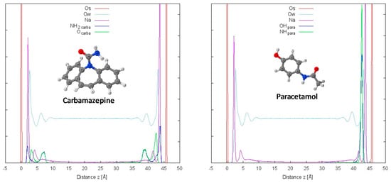 The simulation box is shown in Figure 3, whereas Figure 4 shows the density profiles (DPs) calculated along the box z-coordinates for both carbamazepine and paracetamol. For both PCs, we observe two planes of water molecules at 2.60–2.65 Å and 6.20–6.30 Å above/below saponite surfaces; a third plane, less pronounced, appears at ~9.15–9.30 Å (Table 1). The water density is constant in the center of the box and corresponds to that of liquid water. Sodium cations are also organized as two planes, with a well-defined first atomic plane presenting a higher peak near the upper layer compared to the lower one, with ~37.7% and ~24.5% of the total number of Na+ cations, respectively. This difference arises from a larger number of substitutions in the upper layer (11 out of 19 substitutions), thus attracting more cations. The second cationic planes are at 4.15–4.25 Å and each contains ~7% of the total number of cations. Overall, ~75% of charge-compensating cations are present in these two sets of planes.