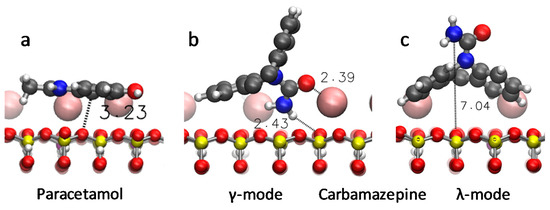 Representative snapshots of the adsorption of paracetamol (a) and carbamazepine adopting the γ-mode (b) and the λ-mode (c) on the clay surfaces. Distances are in Å. Oxygen atoms are shown in red, carbons in grey, hydrogens in light grey, silicium in yellow, and sodium cations in pink. Water molecules have been omitted for the sake of clarity.