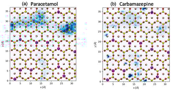 Figure 6 shows the position of the molecules’ center when adsorbed on the upper layer surface. Paracetamol remains in diffuse regions free of substitutions, consistent with the lack of interactions with cations. On the contrary, high-density positions of carbamazepine at the surface are more localized, although carbamazepine density appears lower than that of paracetamol (carbamazepine adsorption on the upper surface represents only 2/3 of the production time). The high-density regions are systematically located close to substituted tetrahedral sites, where carbamazepine is retained through cation coordination, corresponding to the adsorption in the γ-mode. When adsorbed in the λ-mode, carbamazepine is more mobile, interacting only through van der Waals interactions with the layer surface. In contrast, for the γ-mode, carbamazepine remains in the same adsorption site until a cation exchange occurs, which drags the molecule, leading to the disruption of the H-bond with surface oxygens.