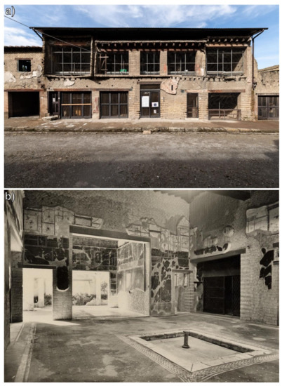 (a) Exterior of the House of the Bicentenary (Photo: Scott Warren); (b) View of the tablinum of the House of the Bicentenary (1938–1939) from the atrium at the time of excavation [17].