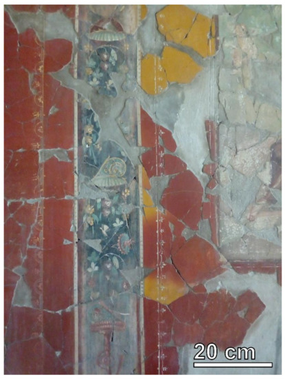 The decoration is painted over a complex plaster stratigraphy typical of Roman wall painting techniques (Figure 3), beginning with a series of progressively finer plaster layers composed of a lime-based binder with local silicate-based volcanic sand as aggregate [19], covered in the lower and upper registers by a fine finishing plaster composed of lime and marble dust. The finishing plaster on the upper register is a coarser preparation with less comminuted marble particles with respect to the lower registers. Furthermore, this final plaster layer is tinted pink superficially in the lower registers and the upper register of the south wall for an approximate thickness of 1 mm through the addition of a diluted admixture of red ochre pigment. Finally, the finishing plaster on the lower south wall contains crushed brick as aggregate [18]. The red and yellow backgrounds were painted in fresco technique, while mezzofresco or secco techniques were employed for the black backgrounds [20]. Materials analyses identified yellow ochre, red ochre, and carbon black as main background pigments. The frieze along the three walls and delicate architectural, floral, and figurative elements are painted in mezzofresco or secco technique, including high-quality figurative scenes imitating portable paintings that are centrally located in the panels of the lower registers. They are rectangular in the central panels and round in the side panels. The palette is typical of Roman paintings of the period, including pigments such as green earth, Egyptian blue, cinnabar, and lime white [18].